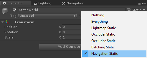 De asemenea, nu uitați să marcați fiecare obiect static din scenă ca static de navigare înainte de a coace NavMesh: