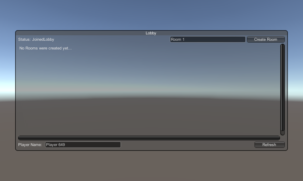 Să începem prin a crea o scenă Lobby care va conține logica Lobby-ului (Rasfoirea camerelor existente, crearea de noi camere etc.):
