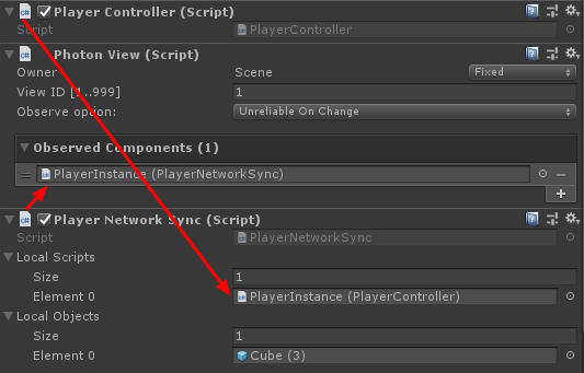 }- Adăugați scriptul PlayerNetworkSync.cs la PlayerInstance și atribuiți-l Componentelor observate PhotonView.