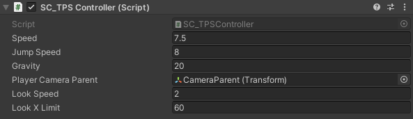 }- Atașați scriptul SC_TPSController la obiectul "Player" (Veți observa că a adăugat și o altă componentă numită Character Controller. Schimbați-i valoarea centrală la (0, 1, 0))