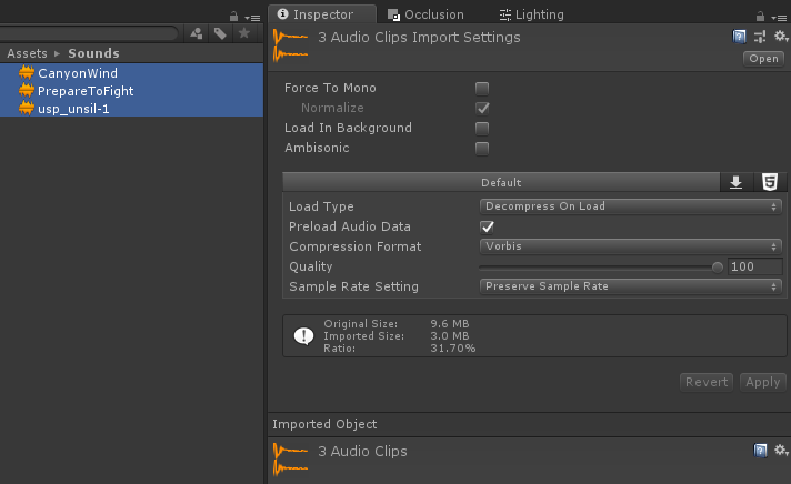 De exemplu, în proiectul meu, am 3 sunete cu scopuri diferite și, după cum puteți vedea, toate au setări implicite de import care nu sunt potrivite pentru fiecare tip de sunet.