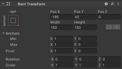 - Setați valorile "JoystickRight" Rect Transform la fel ca în captura de ecran de mai jos: