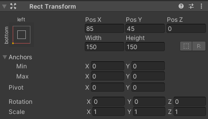 - Setați valorile "JoystickLeft" Rect Transform la fel ca în screenshot de mai jos: