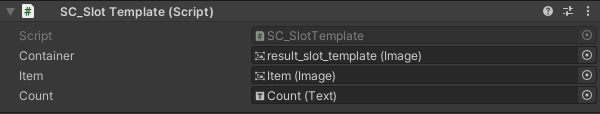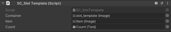 - Atașați scriptul SC_SlotTemplate la obiectul "slot_template" și atribuiți variabilele acestuia (componenta imagine de pe același obiect merge la variabila "Container", copil "Item" Imaginea merge la variabila "Item" și un copil "Count" Textul trece la variabila "Count")