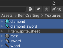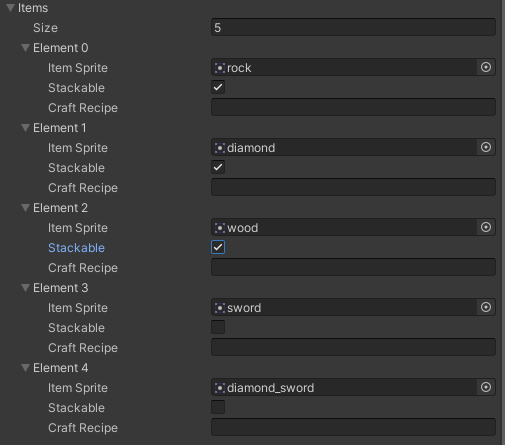 - În SC_ItemCrafting modificați Dimensiunea elementelor la 5 și atribuiți fiecare sprite variabilei Item Sprite.