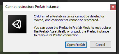 - Unele acțiuni nu sunt acceptate atunci când editați Prefab direct în scenă, de exemplu, dacă trebuie să restructurați ierarhia, vi se va prezenta mesajul "Cannot restructure Prefab instance" și opțiunile fie pentru "Open Prefab", fie pentru "Cancel".