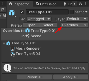 - Când modificați prefabricate în Scenă, modificările nu sunt salvate automat, în schimb, trebuie să selectați manual obiectul rădăcină al prefabricatului, iar în Vizualizare inspector faceți clic pe "Overrides" apoi faceți clic pe "Apply All" pentru a salva modificările sau "Revert All" pentru a anula modificările.